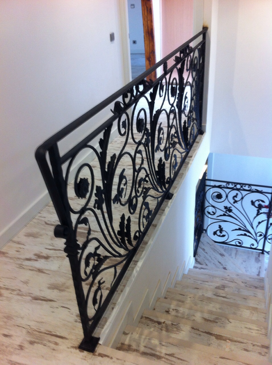 Barandilla de hierro forjado. Barandilla interior, diseño elaborado de elementos de forja, balaustres de tubo amartillado, pasamano macizo y arranque forjado en caliente. El precio de fabricación por metro lineal es de 455,00€.