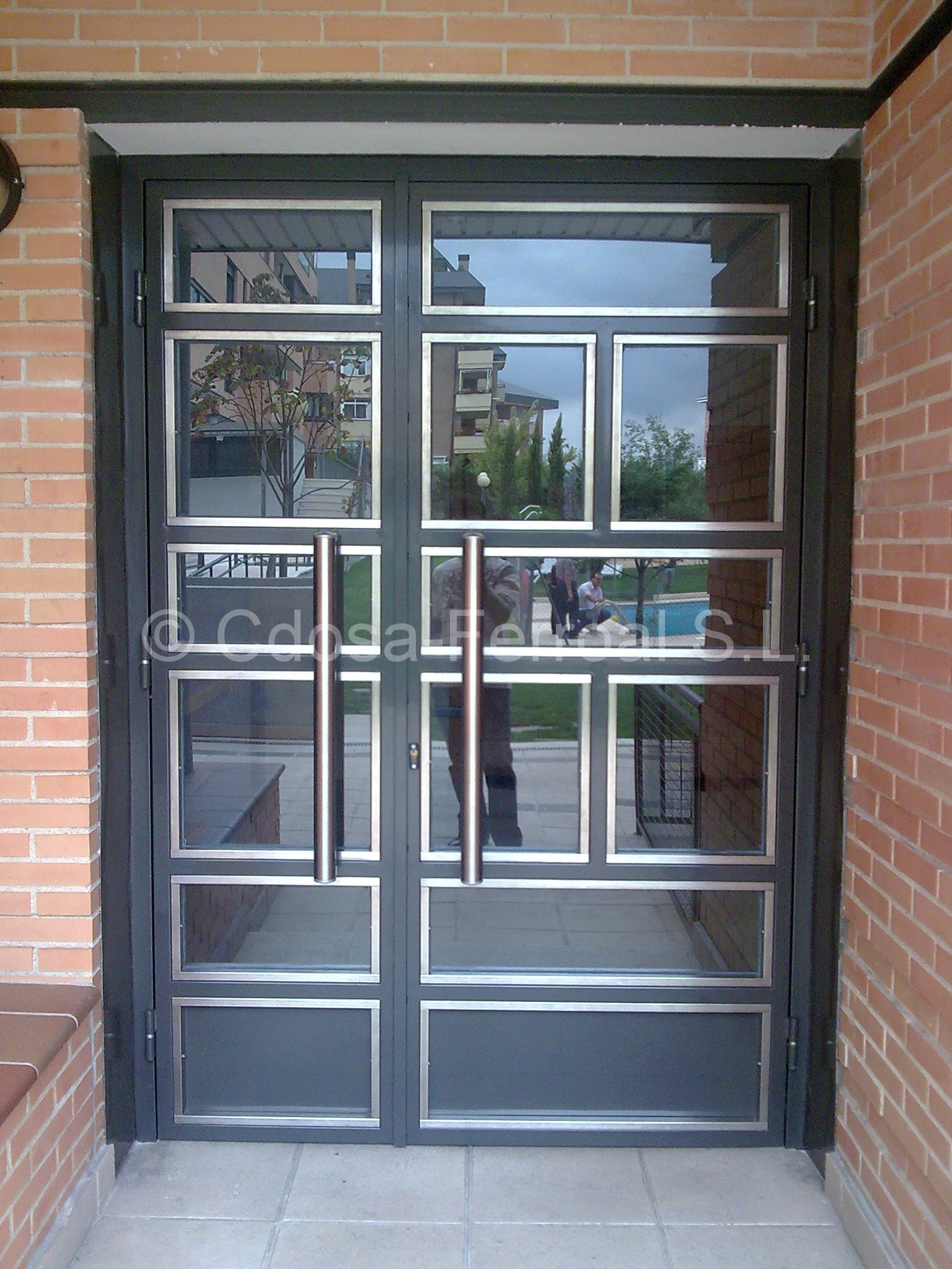 Puerta de portal hecha de tubo cuadrado de 50×50 y junquillos de acero inoxidable de. Tirador de tubo redondo de 40mm inox. precio 459€ el M2 Si lo que buscan no se encuentra en esta web, pueden enviar un boceto o foto. se lo valoramos sin ningún compromiso