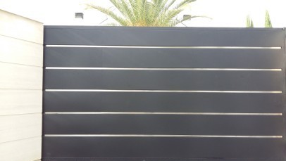 [ezcol_1fifth][/ezcol_1fifth] [ezcol_4fifth_end]Puerta de garaje moderna con adornos de acero inoxidable. Este modelo puede hacerse como puerta corredera o abatible. Esta formada por bastidor de tubo hueco de 80x80x3mm, tubos de refuerzo internos y pletina de 30x3mm de acero inoxidable para los adornos. Esta puerta de lineas sencillas y limpias aporta un toque moderno. Coste de fabricación por m2-549,00€. Los acabados son de pintura en polvo de poliester al horno, del color de la carta RAL.[/ezcol_4fifth_end]